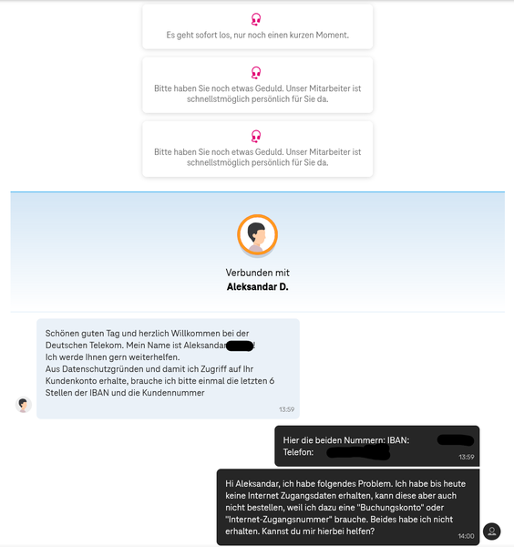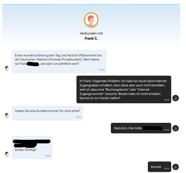 In einem letzten verzweifelten Ansatz habe ich dann nochmal versucht meine verbleibenden zwei Gehirnzellen aneinander zu reiben und bin zu dem Entschluss gekommen “Ohne Zugangsdaten wahrscheinlich keine DSL-Verbindung, und damit keine LeitungsID”. Also habe ich nochmal über den Support versucht an meine Internet-Zugangsdaten zu kommen.